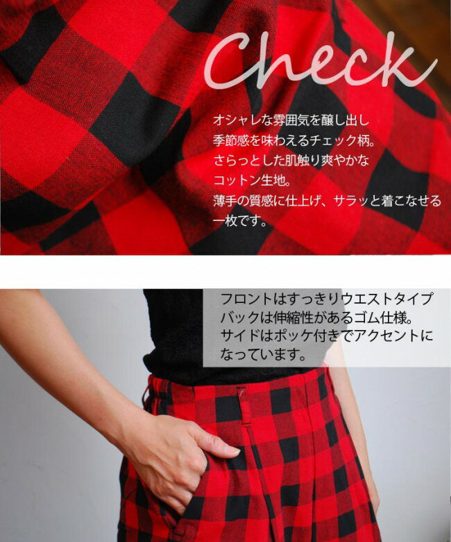 ガーリーなスタイリングはもちろん、カジュアルスタイルにも◎ 着用イメージ ITEM SPEC サイズ ■モデル身長163cm ■サイズ Mサイズ ■ボトム丈:90cm ■ウエスト:68cm(ゴム) ■ヒップ:101+cm ■前ワタリ:39cm ■前股上:35cm ■後股上:36cm ■裾周り:55cm ■股ぐり:79.5cm ■表地 ポリエステル58% レーヨン30% 綿12% ■裏地 ポリエステル64% 綿36% ■カラー:レッド・ネイビー ■仕様:裏地なし・透け感なし・伸縮性ウエスト部分のみあり ご注意点 ・素材の性質上、染料の匂いが強いものがございます。