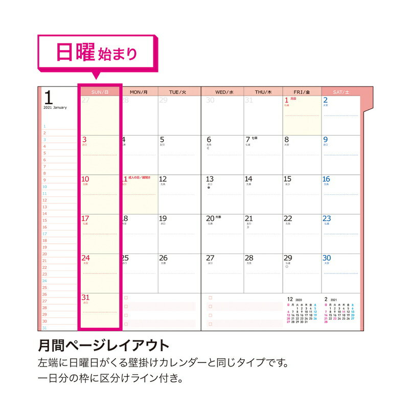 特徴●大きく書ける薄型手帳です●編集タイプ「C-7b」●B6サイズ/68ページ●日曜始まり【本文内容】<カレンダーページ>・月間スケジュール:2020.12〜2022.3<カレンダー以外の情報ページ>・年間カレンダー・年間計画表・毎月メモ・メモ・テレフォンガイド/郵便料金表・年齢早見表/アドレスメモ/チェックリスト・災害時の連絡ガイド/緊急時の連絡先メモ・防災の備えメモ・パスワード番号リスト※路線図・インデックス補強シールは付属しておりません。
